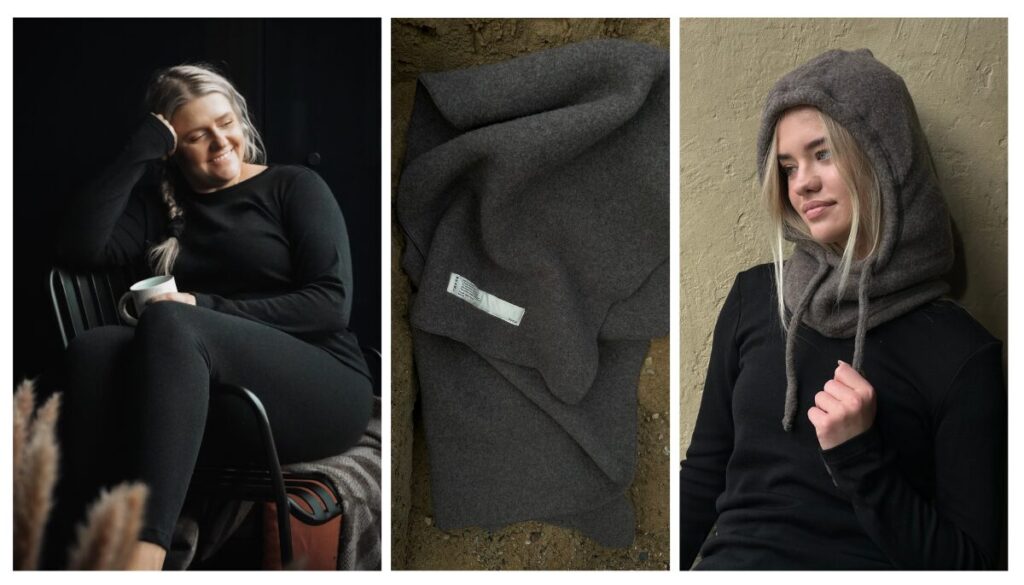Meriinovilla sall ja meriinofliisist tuukrimüts lisavad komplektile põhjamaise stiilielemendi: pehme tekstuur, naturaalne materjal ja rahulikud toonid loovad sooja, aga modernse mulje, mis sobib nii linna kui loodusesse.